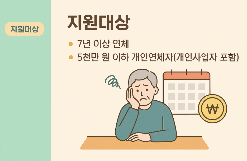 ‘7년 이상 장기연체’ + ‘채무 원금 5천만 원 이하’의 개인채무자가 기본 조건이에요.