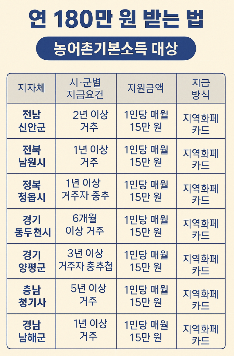 - 지급 지역: 인구감소지역 7개 군 (경기 연천군, 강원 정선군, 충남 청양군, 전북 순창군, 전남 신안군, 경북 영양군, 경남 남해군)