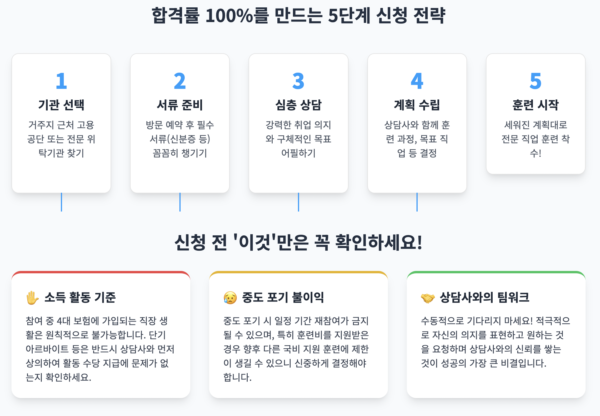 - 1단계 심층 상담 (가장 중요): 상담사에게 취업에 대한 강력한 열정과 구체적인 목표를 어필하세요. "뭐든 시키면 하겠다"가 아니라, "저는 OOO 분야의 전문가가 되고 싶습니다!"라고 말하는 것이 성공의 지름길입니다.