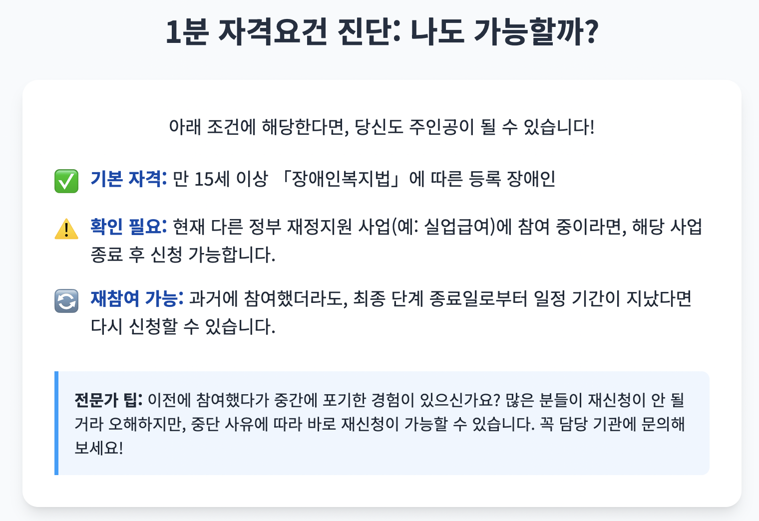 | 기본자격 | 만 15세 이상 등록 장애인 | 나이 제한은 거의 없으며, 취업 의지가 가장 중요합니다. |