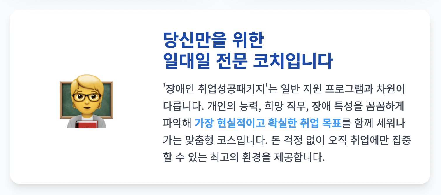- 맞춤 코칭: 일반 프로그램에서 놓치기 쉬운 개인의 능력, 희망 직업, 장애 특성을 꼼꼼하게 파악해서 진짜 현실적인 취업 목표를 잡아줍니다.