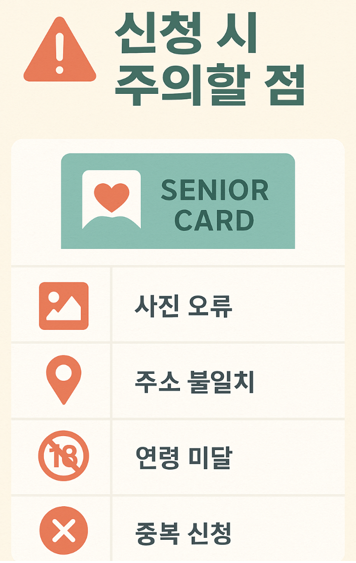 노인복지카드 신청은 간단하지만, 아래 항목 중 하나라도 빠지면 반려될 수 있어요.